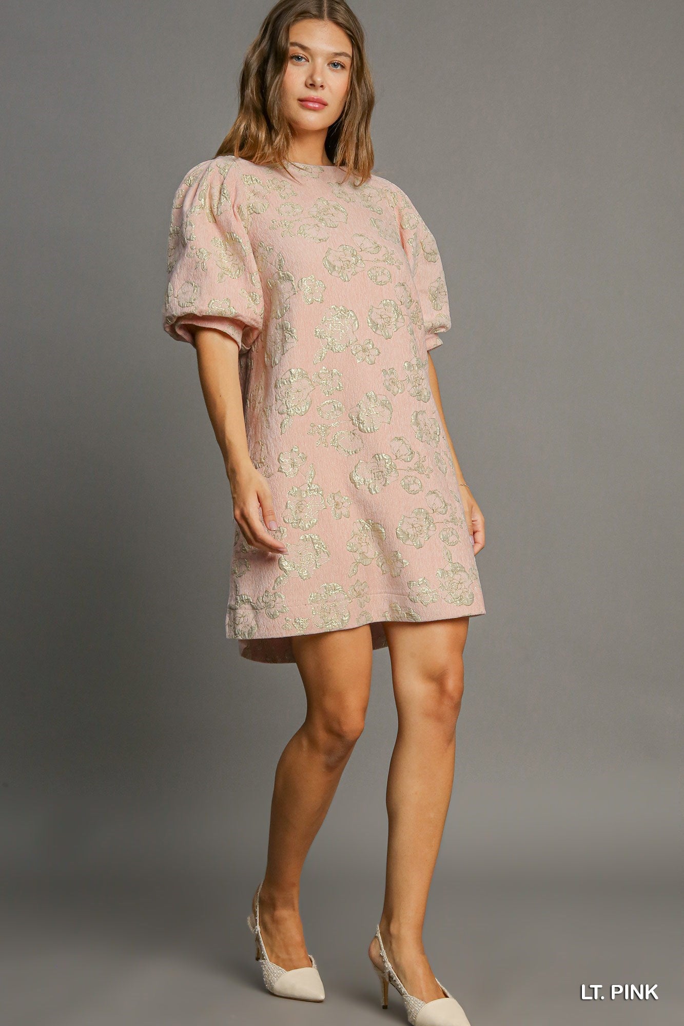 Brighten up your wardrobe with Brynlee, a playful mini dress featuring a floral jacquard design and on-trend corduroy fabric. The metallic detailing adds a touch of shimmer while the puff sleeves and back keyhole button add a unique touch. Lined for comfort, this dress is perfect for any occasion. Model is 5'9" and wearing a small. Made with 100% polyester.